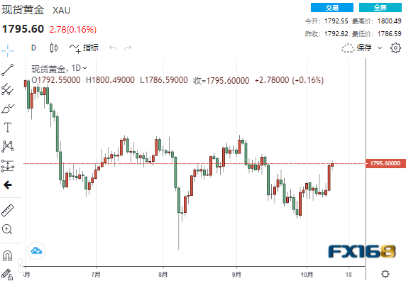 美市尾盘,现货黄金收报1795.60美元/盎司,小幅上涨2.78美元或0.16%,盘中曾创下9月15日以来的最高水平1800.49美元,最低触及1786.59美元。