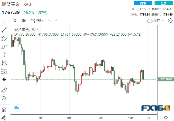 美市尾盘,现货黄金收报1767.39美元/盎司,大幅下跌28.21美元或1.57%,盘中最低触及1764.69美元,最高触及1796.37美元。本周,现货黄金上涨10.38美元或0.59%。
