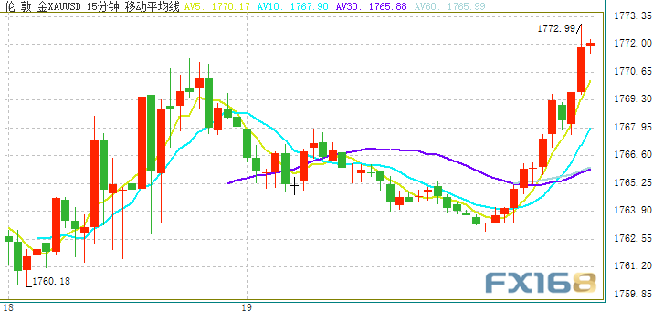 现货黄金自1760美元/盎司附近水平快速上涨,金价目前最高触及1772.99美元/盎司。