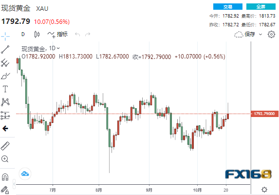 美市尾盘,现货黄金收报1792.79美元/盎司,上涨10.07美元或0.56%,盘中最高触及1813.73美元,最低触及1782.67美元。本周,现货黄金价格上涨了25.40美元或1.44%。