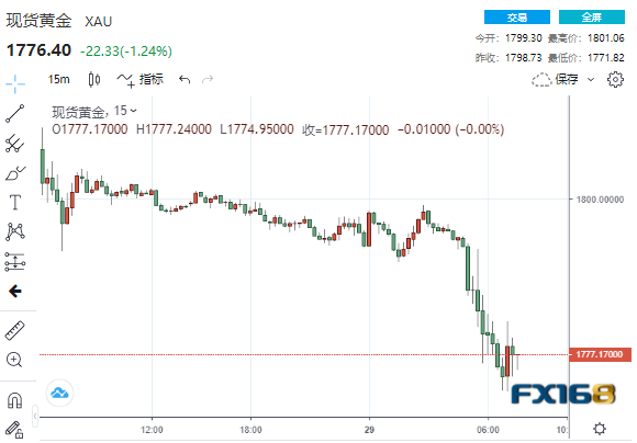 欧美时段盘中,现货黄金波动剧烈,在突破1800美元大关后持续走低,触及1771.82美元低点,较日高回落近30美元。
