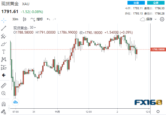 (现货黄金30分钟走势图,来源:FX168)