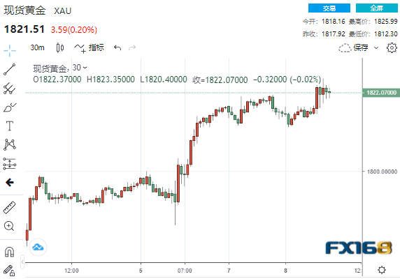 (现货黄金30分钟走势图,来源:FX168)