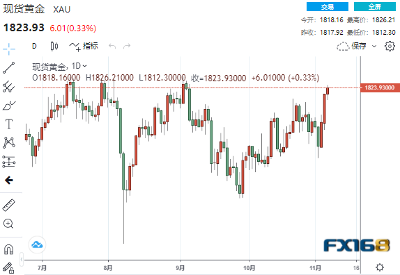 美市尾盘,现货黄金收报1823.93美元/盎司,上涨6.01美元或0.33%,盘中最高触及1826.21美元,最低触及1812.30美元。