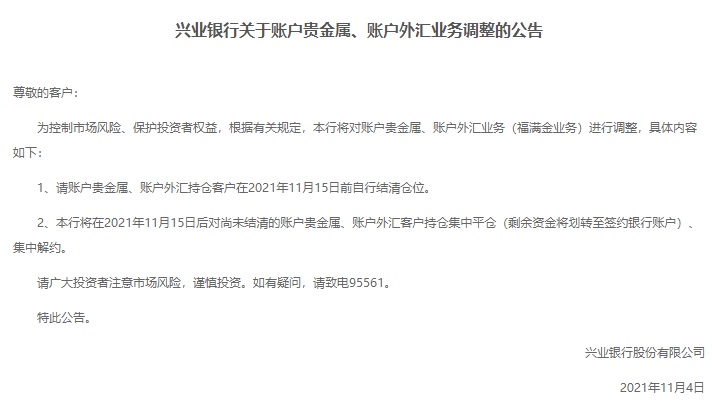 兴业银行将在2021年11月15日后对尚未结清的账户贵金属、账户外汇客户持仓集中平仓(剩余资金将划转至签约银行账户)、集中解约。兴业银行表示,请账户贵金属、账户外汇持仓客户在2021年11月15日前自行结清仓位。