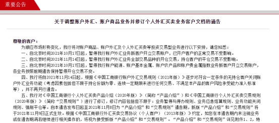 工行公告说明称,个人外汇买卖业务是指个人客户委托的以国际外汇市场行情为基础,将一种可自由兑换外汇兑换成另一种可自由兑换外汇的个人外汇业务。本次该行仅修订个人外汇买卖业务“产品介绍”和“交易规则”,不涉及个人结售汇业务。