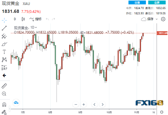 美市尾盘,现货黄金收报1831.68美元/盎司,上涨7.75美元或0.42%,盘中触及9月3日以来的最高水平1832.65美元,最低触及1819.05美元。