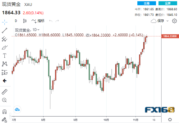 自11月3日以来,金价上涨了110美元,原因是对通胀的担忧加剧,以及主要央行保证目前利率将维持在低位。