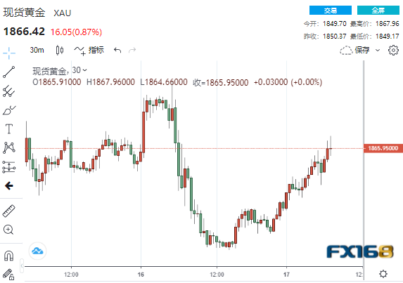 (现货黄金30分钟走势图,来源:FX168)