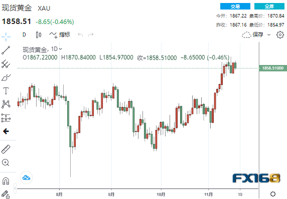 美市尾盘,现货黄金收报1858.51美元/盎司,下跌8.65美元或0.46%,日内最高触及1870.84美元,最低触及1854.97美元。