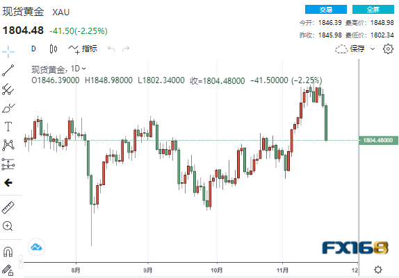 美市尾盘,现货黄金收报1804.48美元/盎司,大幅下跌41.50美元或2.25%,日内最高触及1848.98美元,最低触及1802.34美元为11月5日以来的最低水平。上周,现货黄金下跌18.35美元或0.98%。