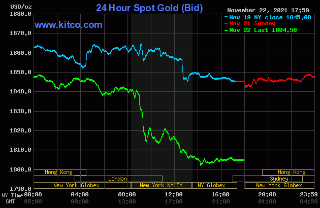 美市尾盘,现货黄金收报1804.48美元/盎司,大幅下跌41.50美元或2.25%,日内最高触及1848.98美元,最低触及1802.34美元为11月5日以来的最低水平。