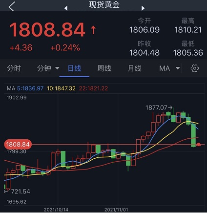 现货黄金周一收报1804.48美元/盎司,大幅下跌41.50美元或2.25%,日内最低触及1802.34美元/盎司,为11月5日以来的最低水平。