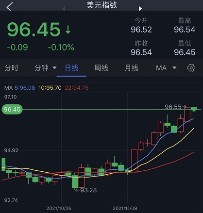 追踪美元兑六种主要货币走势的ICE美元指数周二收盘上涨0.42%至96.53,盘中最高触及96.55,创去年7月以来新高。