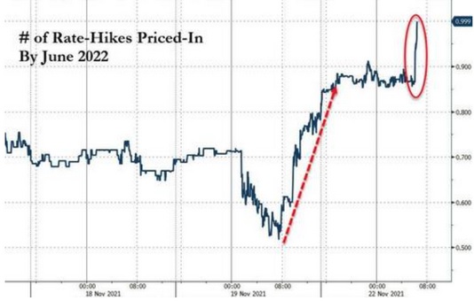 但美国此后发布的经济数据强得出人意料。美国10月消费者物价指数(CPI)较去年同期增长6.2%,这是自1990年11月以来的最高纪录。就业市场的强劲程度也超出了预期。在9月份增加31.2万人后,上月非农就业人口进一步增加了53.1万,失业率从4.8%降至4.6%。