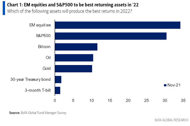 调查显示,34%的基金经理说,新兴市场将是明年的首选领域。标普500指数以30%的得票率位居第二,预计将成为2022年表现最佳的资产之一。