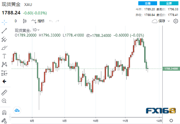 美市尾盘,现货黄金收报1788.24美元/盎司,微幅下跌0.60美元或0.03%,日内最高触及1796.33美元,最低触及自11月4日以来的最低水平1778.41美元。