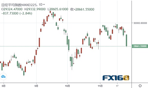 日经225指数一度大跌3%;日本东证指数下跌1.9%,为10月1日以来最大跌幅,所有行业板块均出现下跌。MSCI亚太指数下跌1.3%。
