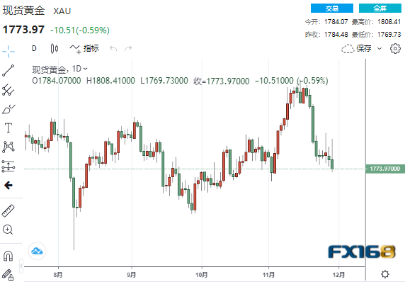 COMEX 2月黄金期货收跌0.5%,报1776.50美元/盎司,主力合约11月份累计下跌约0.4%。