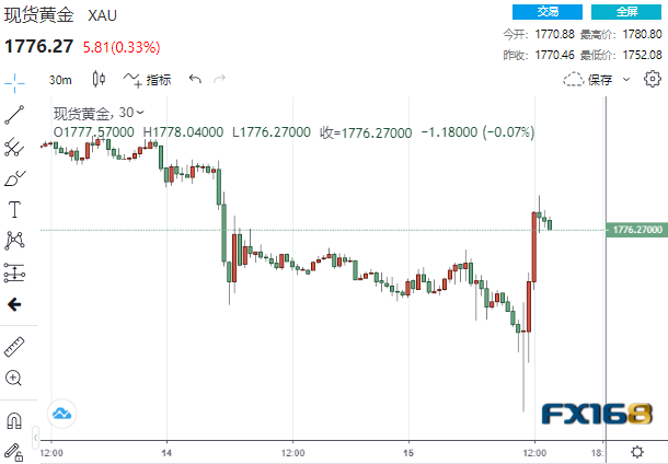 利率决议公布后,现货黄金一度下跌逾10美元,但自鲍威尔讲话期间,现货黄金持续回升,较决议公布后低位反弹超28美元,触及1780.80美元高点。