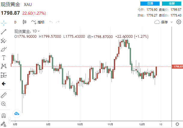 美市尾盘,现货黄金收报1798.87美元/盎司,上涨22.60美元或1.27%,日内最高触及1799.57美元高点,最低触及1775.43美元。