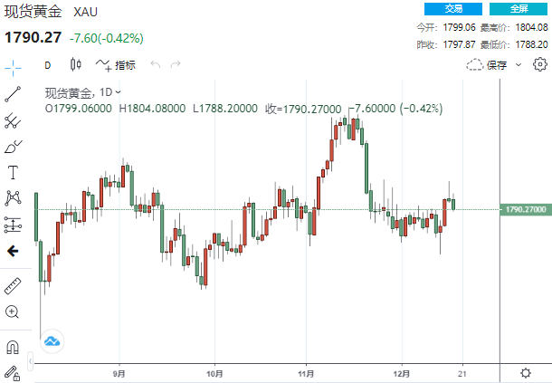 美市尾盘,现货黄金收报1790.27美元/盎司,下跌7.60美元或0.42%,盘中一度触及1804.08美元高点,但随后自高位回落并刷新日低至1788.20美元。
