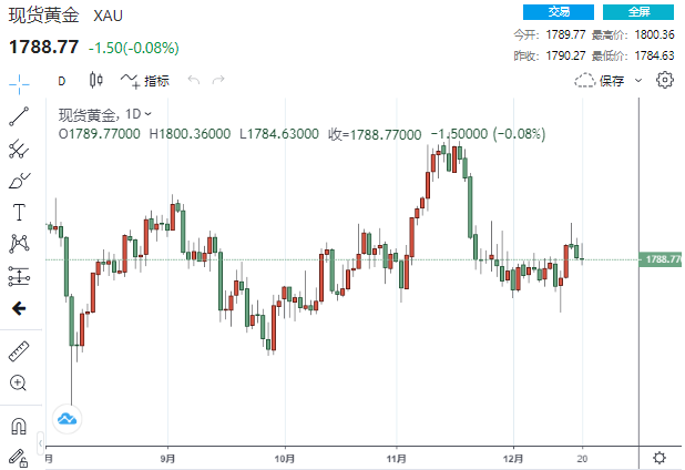 美市尾盘,现货黄金收报1788.77美元/盎司,下跌1.50美元或0.08%,盘中一度触及1800.36美元高点,但随后自高位回落并刷新日低至1784.63美元。