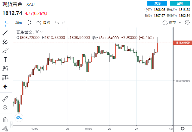 美市尾盘,现货黄金收报1811.77美元/盎司,上涨3.80美元或0.21%,盘中一度触及1813.38美元高点,较此前触及的低点1802.84美元反弹了超11美元。上周,现货黄金上涨10.10美元或0.56%。