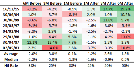 如下图所示,黄金在第一次加息的前期挣扎,平均下跌2%,然后在接下来的6个月内回升。