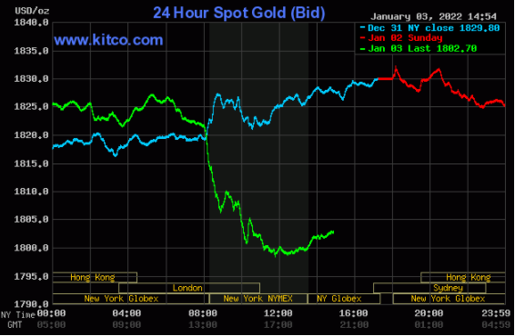 24K99讯 周一(1月3日)是2022年的第一个交易日,黄金和白银期货价格均大幅下跌。美市尾盘,2月期金下跌29.60美元,报1799.00美元/盎司;3月纽约商品交易所期银下跌0.487美元,报22.87美元/盎司。