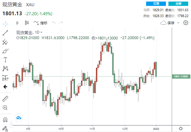美市尾盘,现货黄金收报1801.13美元/盎司,大幅下跌27.20美元或1.49%,创下一个多月来最大单日百分比跌幅,盘中一度触及1831.63美元高点,但随后很快冲高回落并刷新日低至1798.22美元。
