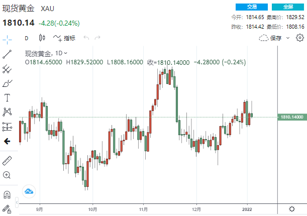 美市尾盘,现货黄金收报1810.14美元/盎司,下跌4.28美元或0.24%,盘中一度触及1829.52美元高点,但随后自高位回落并刷新日低至1808.16美元。