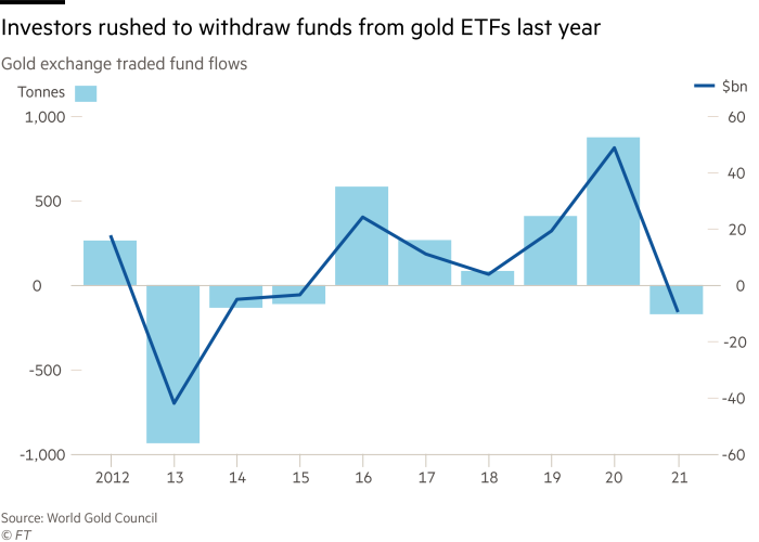 投资者兴趣减弱是拖累金价的主要因素,因为去年对黄金首饰、金条和金币、工业用途的需求以及各国央行的购买量均有所上升。但根据贸易机构世界黄金协会(World gold Council)的数据,投资者的抛售导致2021年实物支持的黄金ETF净流出了173吨黄金,价值91亿美元。