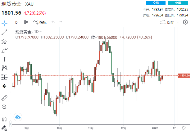 美市尾盘,现货黄金收报1801.56美元/盎司,上涨4.72美元或0.26%,日内最高触及1802.25美元,最低触及1790.24美元。