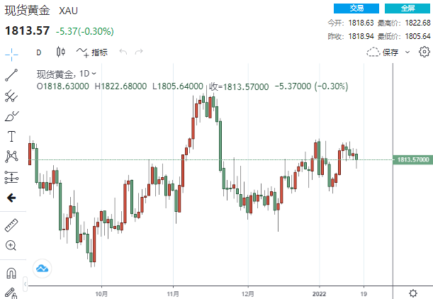 美市尾盘,现货黄金收报1813.57美元/盎司,下跌5.37美元或0.30%,日内最高触及1822.68美元,最低触及1805.64美元。