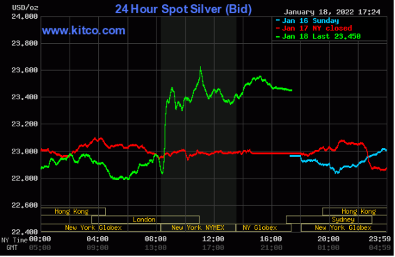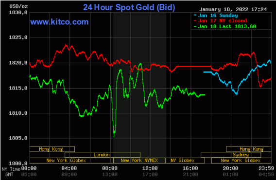 24K99讯 周二(1月18日)美市盘中,黄金价格小幅走低。美国国债收益率上升及美元指数走强,令金价承压。与此同时,白银触及七周高点,多头开始了银价的近期上涨趋势。本周早些时候市场上一些更强烈的风险偏好支持了避险金属。美市尾盘,现货黄金收报1813.57美元/盎司,下跌5.37美元或0.30%,日内最高触及1822.68美元,最低触及1805.64美元。现货白银收涨1.99%,至23.464美元。
