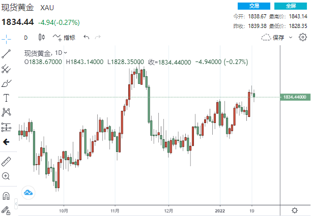 美市尾盘,现货黄金收报1834.44美元/盎司,小幅下跌4.94美元或0.27%,日内最高触及1843.14美元,最低触及1828.35美元。