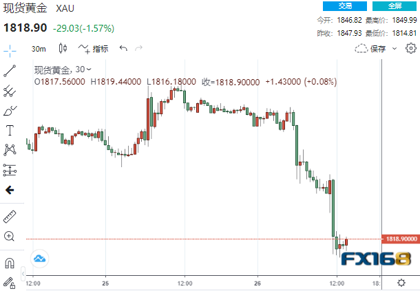 美市尾盘,现货黄金收报1818.90美元/盎司,大幅下跌29.03美元或1.57%,日内最高触及1849.99美元,最低触及1814.81美元。