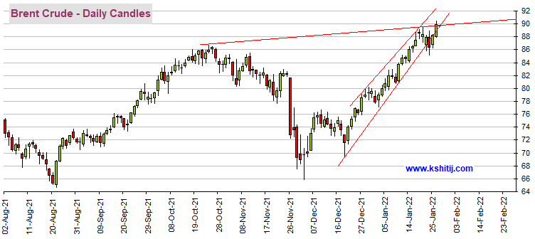 原油方面,Kshitij咨询服务团队表示,布伦特原油期货一度上涨至90.47美元/桶,之后有所回落。考虑到乌克兰和俄罗斯之间的紧张关系,我们需要密切关注90美元/桶的价格走势。目前布油可能维持在85-90美元/桶区间内,但从周线图来看,布油存在升至95美元/桶的空间,不过,只有在持续突破90美元/桶时才会出现。需要观察90美元/桶附近的价格走势。