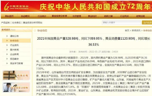 据中国黄金协会最新统计数据显示:2021年,国内原料黄金产量为328.98吨,比2020年减产36.36吨,同比下降9.95%,其中,黄金矿产金完成258.09吨,有色副产金完成70.89吨。另外,2021年进口原料产金114.58吨,同比上升0.37%,若加上这部分进口原料产金,全国共生产黄金443.56吨,同比下降7.50%。