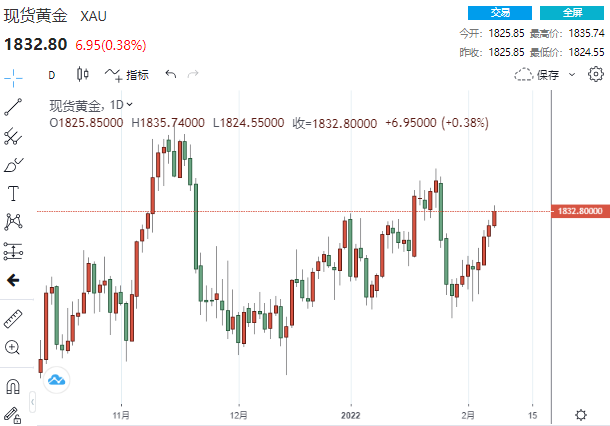 美市尾盘,现货黄金收报1832.80美元/盎司,上涨6.95美元或0.38%,日内最高触及1835.74美元/盎司,最低触及1824.55美元/盎司。