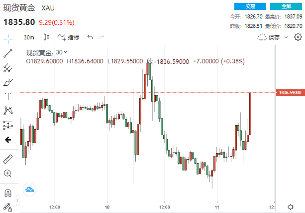 数据公布之后,现货金短线拉升近8美元,刷新日高至1837.09美元。