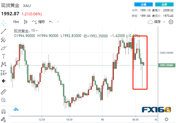 数据公布之后,现货黄金震荡下滑约17美元至1981.60美元/盎司,现回升至1990美元/盎司略上方。