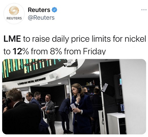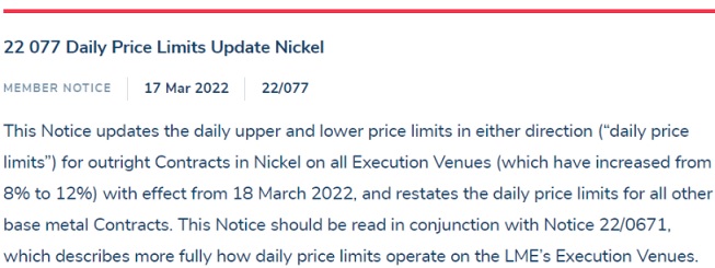 随着青山控股已和银行达成静默协议,银行将不会对青山的镍头寸要求增加保证金或进行平仓后,LME宣布周三(3月16日)恢复镍交易,并把买卖区间设在上周暂停交易前报价的上下5%。但当日交易混乱未平息,LME因此把镍期货的涨跌幅限制提高到 8%。