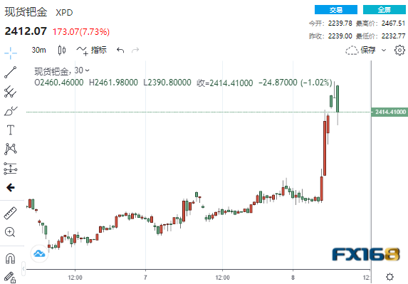 受这一消息影响,现货钯金日内涨超10%至2467.51美元高点,为3月25日以来的新高;现货铂金一度升至990.22美元高点;现货黄金暴拉20美元,刷新日高至1947.97美元。