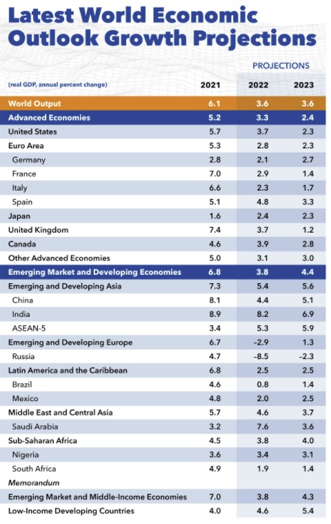 IMF预测,今明两年全球经济增长预期遭下调。IMF将2022年全球经济增长预测从4.4%降至3.6%,将2023年全球经济增长预测从3.8%降至3.6%。