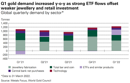 世界黄金协会分析师表示:“在我们看来,黄金价格走强、股市疲弱、通胀预期迅速上升,以及本季度意外的地缘政治事件,都是推动这种需求的关键因素。”