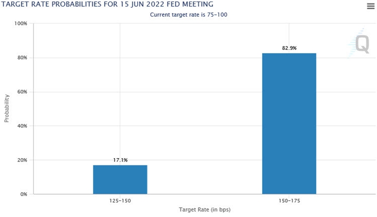 然而,日内加息75点的预期骤然升温。根据芝加哥商品交易所(CME)的美联储观察(FedWatch)工具,美联储6月加息75个基点的可能性已高达82.9%。