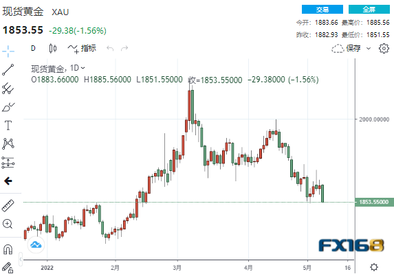 COMEX 6月黄金期货收跌1.3%,创最近一周最大单日跌幅,报1858.60美元/盎司。