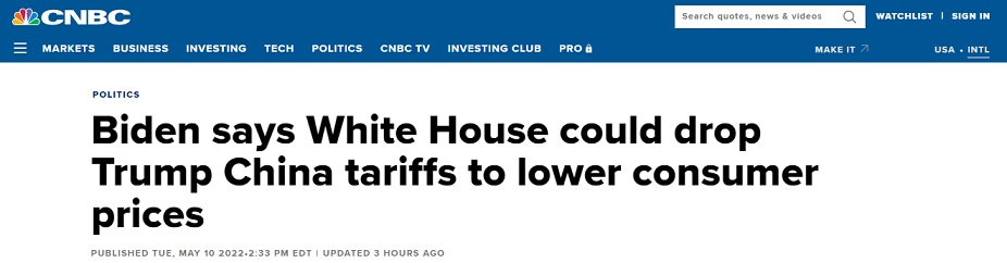 美国消费者新闻与商业频道(CNBC)最新报道称,美国总统拜登当地时间5月10日表示,他可能会取消对中国进口商品征收的部分关税,以帮助控制美国不断上涨的消费者价格。